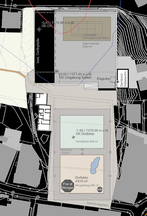 Die gesamte Infrastruktur der Freizeitanlagen und die Gestaltung des Dorfplatzes sind veraltet. Die Kühlberohrung im Eisfeld datiert aus dem Jahr 1967 und befindet sich bereits einige Jahre über der erwarteten Lebensdauer. Um die Sicherheit und den Weiterbetrieb der Eisbahn zu gewährleisten, besteht dringender Handlungsbedarf.