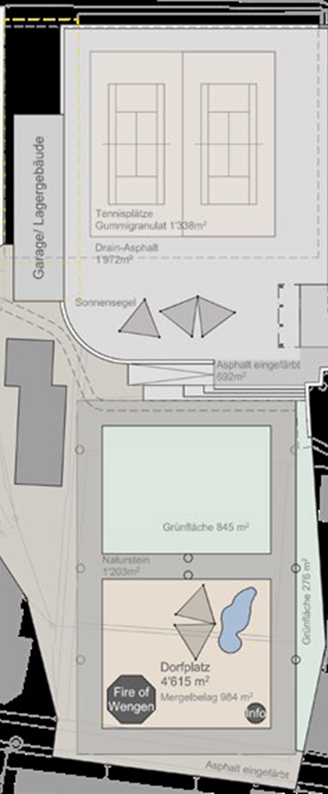 Der grosse, unverbaute Platz mitten im Dorf wirkt nicht einladend, die Grünfläche wird unterteilt vom Tennisfeld. Für Schachspiel, Tischtennis und Picknicktische bleibt nur wenig Platz. Ebenso ist das Eisfeld während der Sommermonate ein trister Betonboden mit Rissen, wird einzig für wenige Veranstaltungen genutzt und ist keine Visitenkarte für Wengen.
