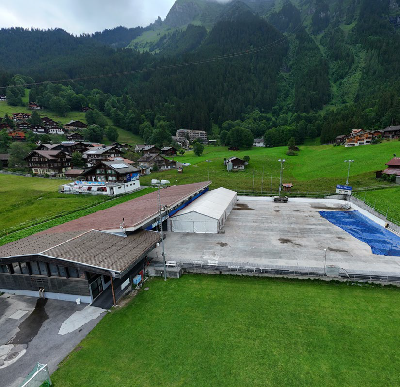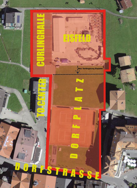 Umsetzung der 1. Phase (Curlinghalle, Eisbahnbereich). Es wird sichergestellt, dass der Tennisplatz und Dorfplatz während dieser Zeit benutzt werden können.