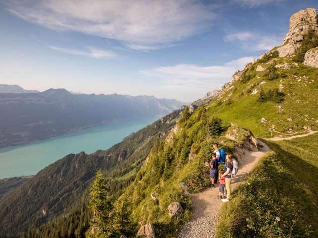 Unterwegs beeindruckt die Vielfalt der Natur: Wälder, Alpweiden und die grandiose Aussicht auf die berühmten Landschaften des Berner Oberlandes mit Thuner- und Brienzersee.