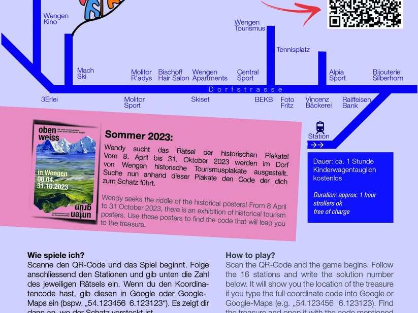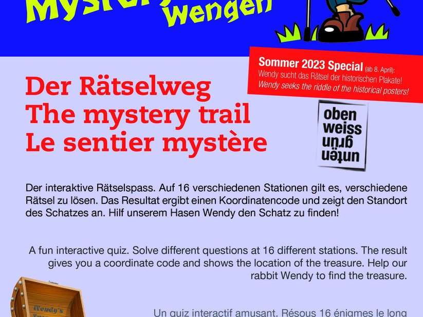 A fun, interactive route between Innerwengen and Allmend with puzzling mysteries to solve along the way. Various puzzle problems to be solved are posted at 16 stops. The answer to the puzzles gives you the coordinates of where the treasure is located. Help Wendy the Rabbit find the treasure!