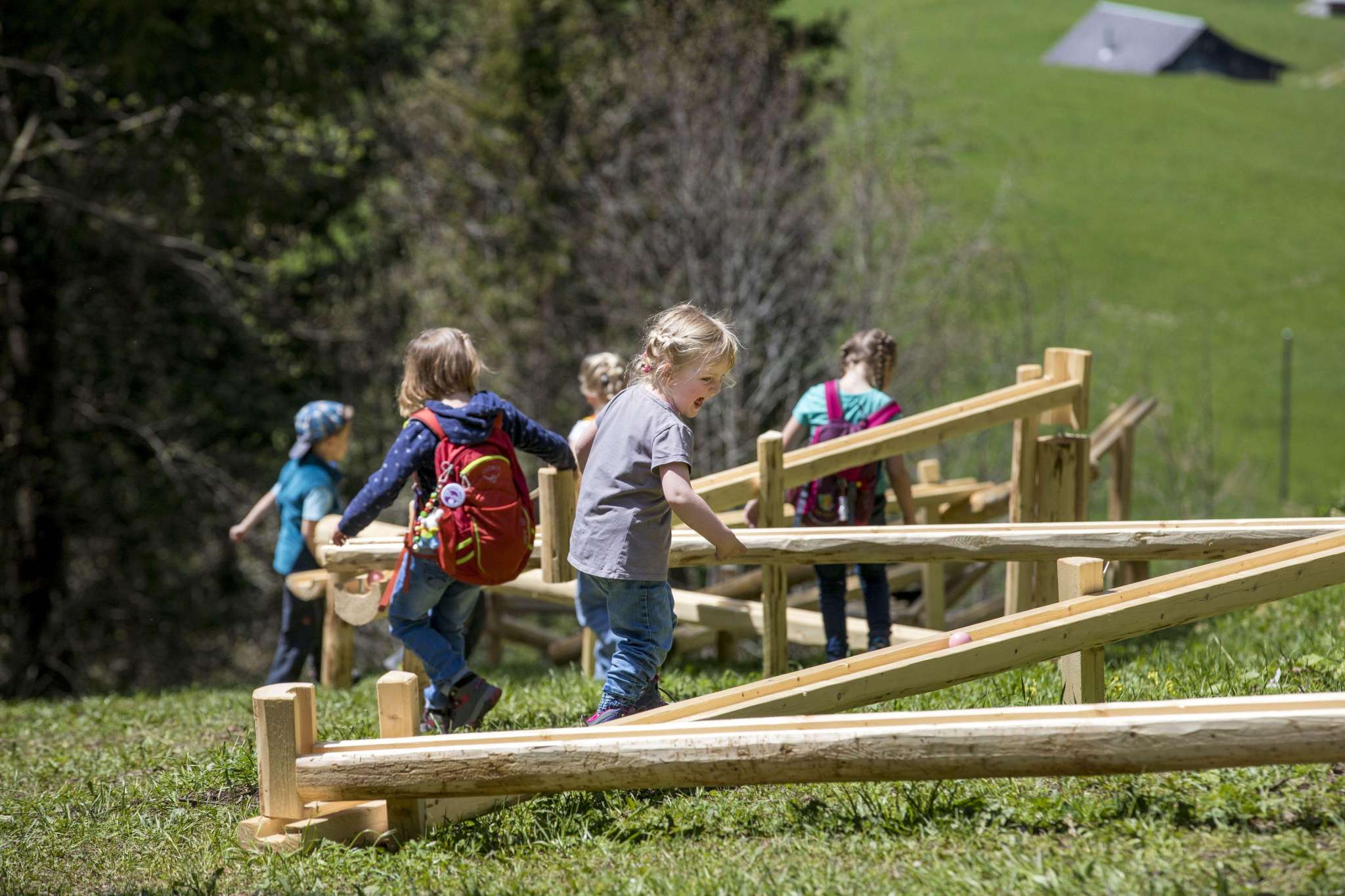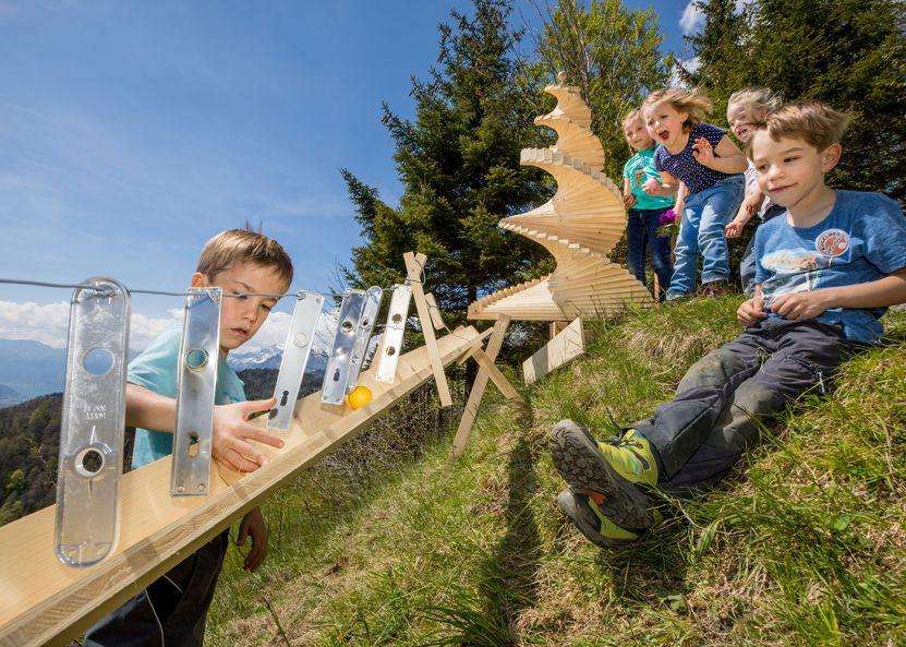 12 exciting and varied marble runs await you along the hiking trail from the Bidmi middle station to the Reuti bottom station. The courses were built by local timber construction companies. It takes around an hour to walk from Bidmi to Reuti. The hiking trail is not suitable for pushchairs.