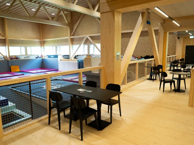 In addition to the trampoline and skating areas, there's a soft multisport zone ideal for yoga, workshops, parkour, and free movement. Spectators can enjoy a full view of the hall from the upper gallery, which includes a cozy bistro area. Kids can go all out while parents relax within sight. There’s something for the whole family to enjoy.