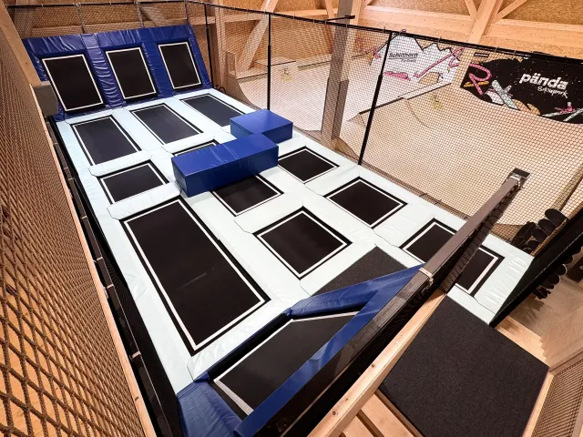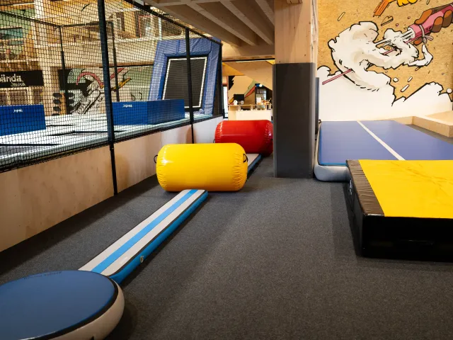 This modern 1,000 m² indoor facility offers a diverse experience centered around movement, sport, and creativity. Whether it's on the Fivesquare trampolines, jumping from the Grandmaster or tower into the airbag, on the Airtrack in the multisport area, or skating on the surface with double mini ramp, spine, and extension – both beginners and advanced athletes will find the perfect playground to express themselves.