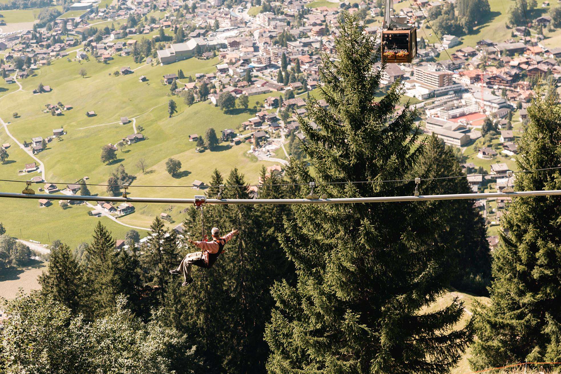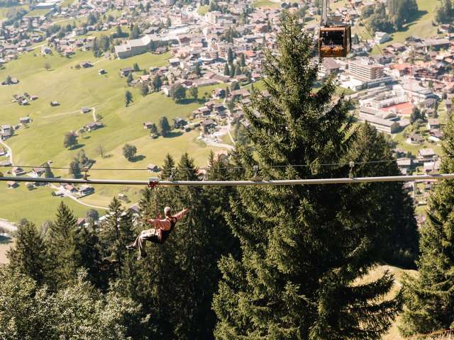 Soar through the forest like a bird on the Fly-Line on the Pfingstegg. You glide gently and silently past rock faces and watercourses. Sometimes just above the ground, then again at a height of 12 metres. The Pfingstegg Fly-Line starts directly below the mountain station of the aerial cableway and immediately disappears into the forest. At the end, a special lift takes you back up to the start. The aim is to enjoy the surroundings, immerse yourself in the world of the forest and return to the start at a slower pace.