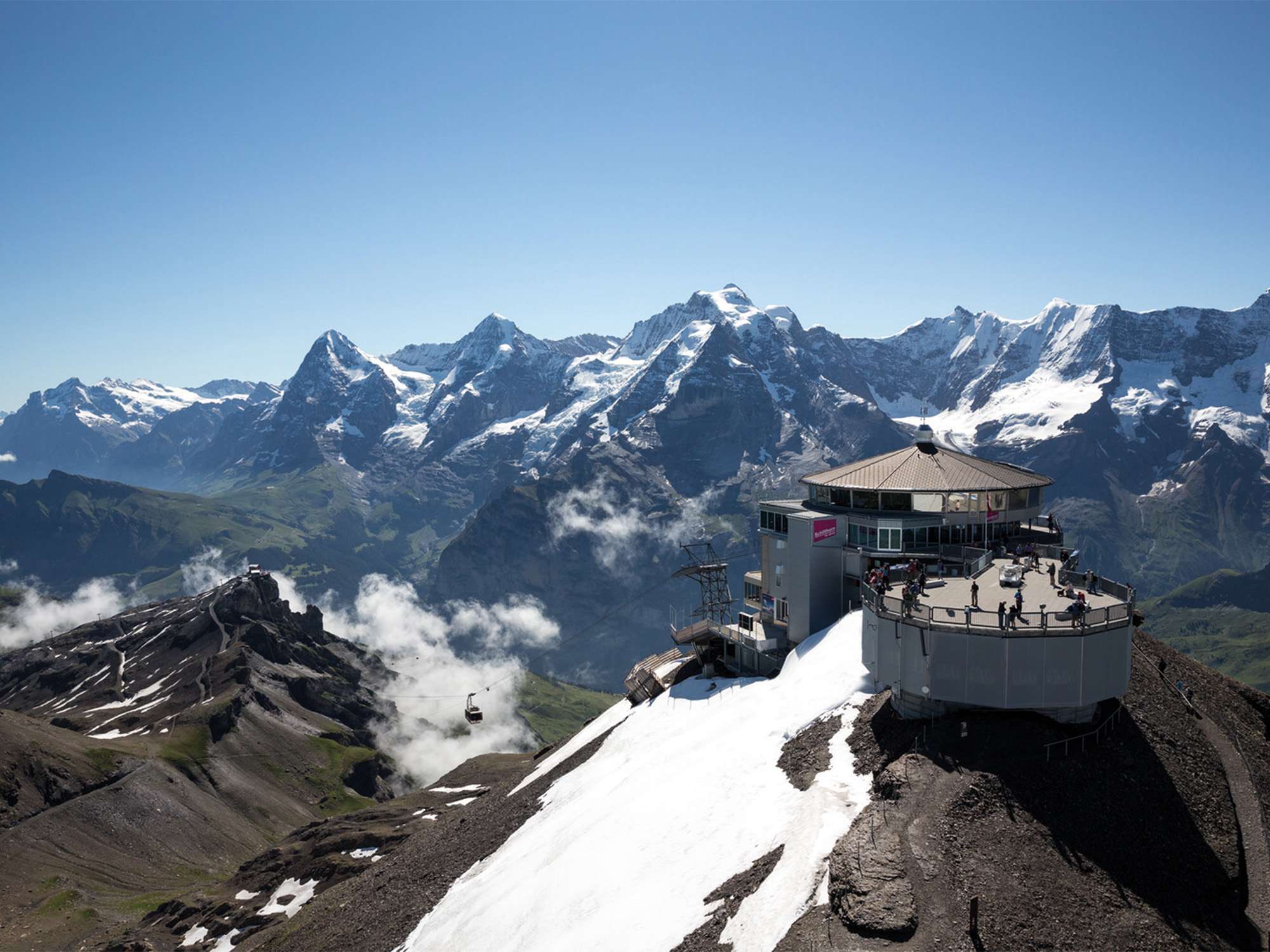 Enjoy the breathtaking view of the UNESCO World Heritage Site with the Eiger, Mönch, Jungfrau and more than 200 other mountain peaks in the world's first 360° restaurant Piz Gloria. When visibility is good, you can even see the Mont Blanc massif and the Black Forest. Enjoy a delicious lunch in the 360° restaurant. The Piz Gloria rotates once around its own axis in 45 minutes. The Piz Gloria building is located on the summit of the Schilthorn. It is surrounded by sloping terrain. In winter, the highest ski piste starts here at just under 3000 metres above sea level. In summer, the summit can be reached via two hiking trails. However, these are often only free of snow in early summer.