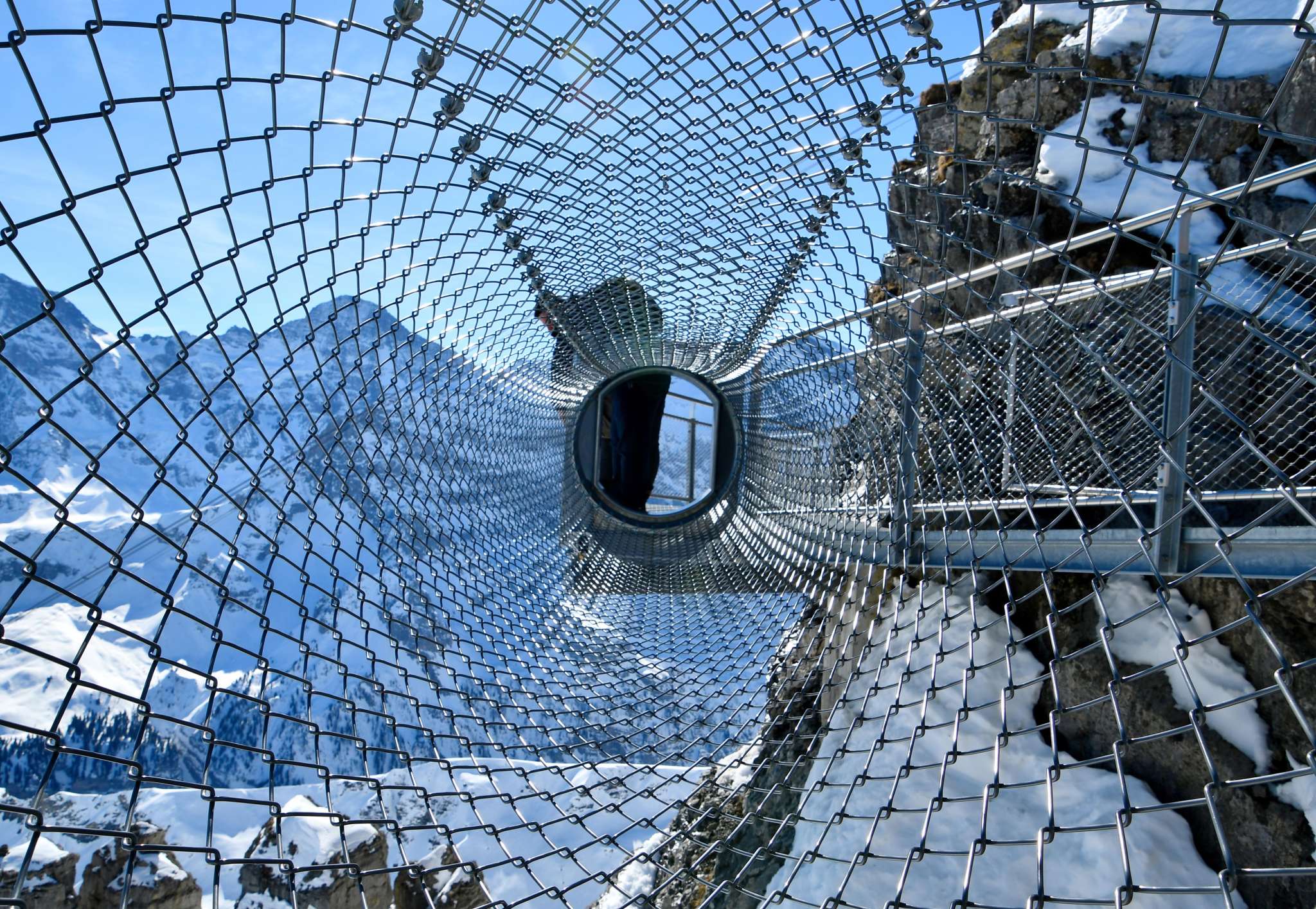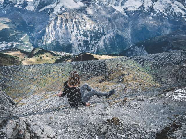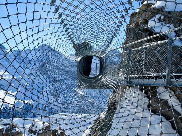 If you make your way from Mürren towards the Schilthorn, you will arrive at the Birg middle station after the first gondola ride. You should plan a longer stop here to visit the Thrill Walk. It guarantees a higher pulse rate for all those who dare to cross it. The approximately 200 metre long rock walkway was built into the rock along the vertical abyss. The construction made of steel and glass as well as a floor made of gratings blends seamlessly into the angular rocky landscape. You should spend around 45 minutes visiting the Thrill Walk so that you have enough time to take some spectacular photos. In addition to the grating that makes up most of the walkway and stairs, there are around 20 metres of glass floor, cattle grid floor elements and a nine-metre-long rope bridge complete with safety net. An eight metre long crawl tunnel completes the experience. The entrance to the Thrill Walk is located on the side of the panoramic terrace at Birg station. After 200 metres of thrills, you will reach the end of the walkway further down. From there, a gravel path (snow-covered in winter) leads up to the station building.