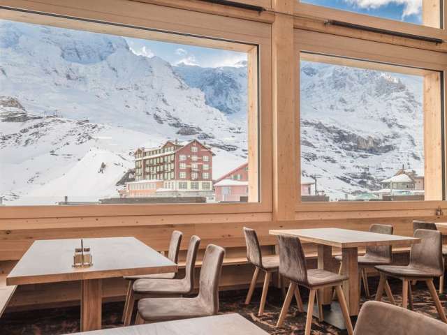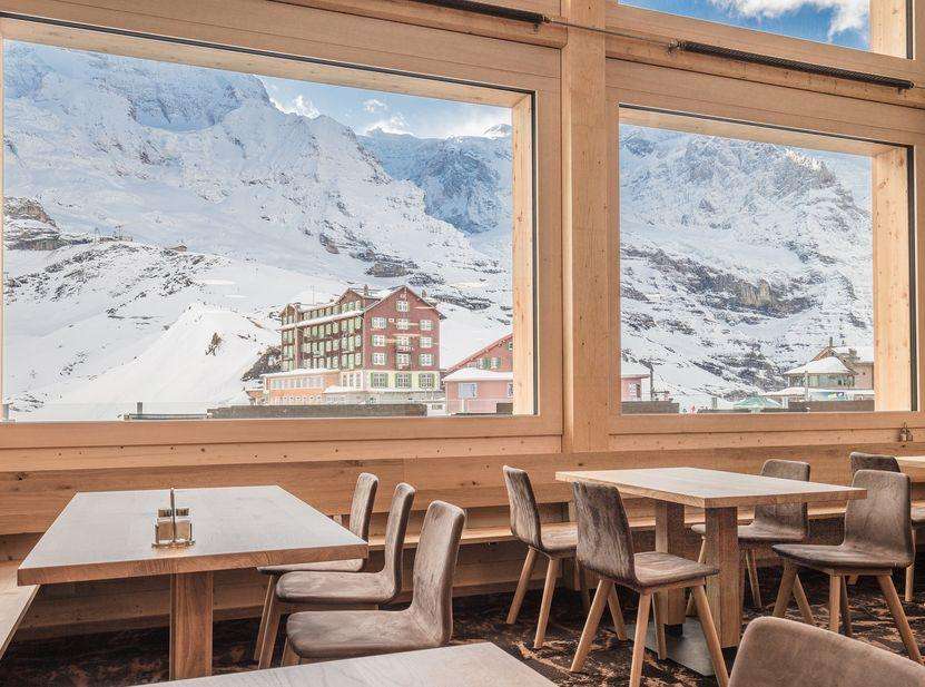 La grande baie vitrée permet d'avoir une vue sur la face nord de l'Eiger, connue dans le monde entier, depuis chaque place assise dans le restaurant. La terrasse autour de l'établissement prend le soleil toute la journée sous un magnifique soleil de montagne.