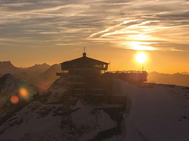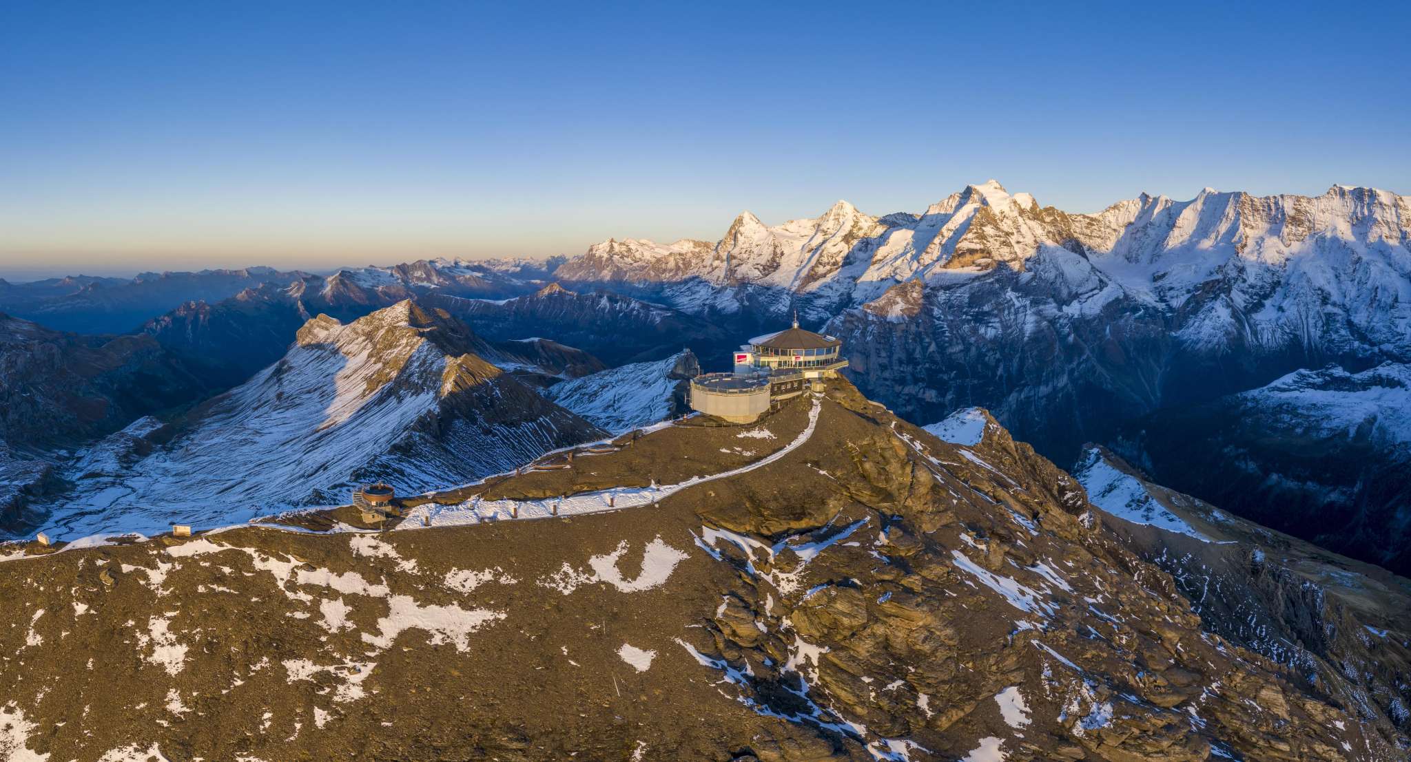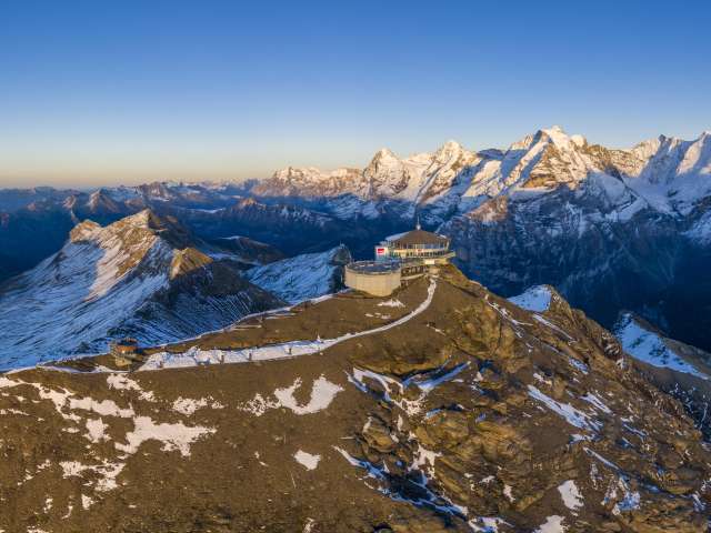 Profite de la vue à couper le souffle sur le patrimoine mondial de l'UNESCO avec l'Eiger, le Mönch, la Jungfrau et plus de 200 autres sommets dans le premier restaurant à 360° du monde, le Piz Gloria. Si les conditions de visibilité sont bonnes, tu peux même voir le massif du Mont-Blanc et la Forêt-Noire. Dans le restaurant 360°, tu dégusteras un délicieux déjeuner. Le Piz Gloria tourne une fois sur son axe en 45 minutes. Le bâtiment Piz Gloria se trouve au sommet du Schilthorn. Tout autour, il est entouré d'un terrain en pente. En hiver, c'est d'ici que part la piste de ski la plus haute, à environ 3000 m d'altitude. En été, le sommet est accessible par deux sentiers de randonnée. Mais ceux-ci ne sont souvent pas enneigés avant le début de l'été.